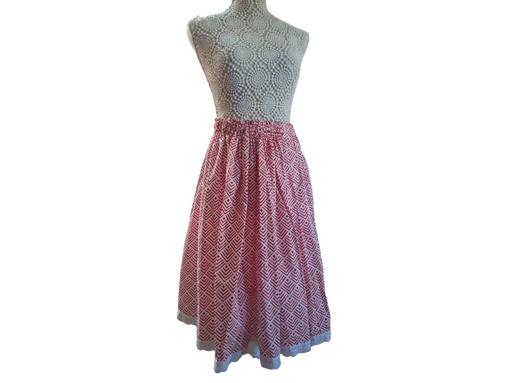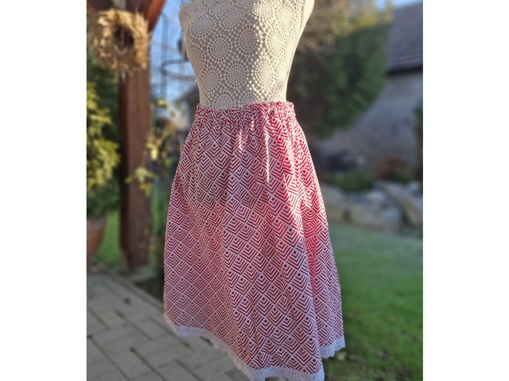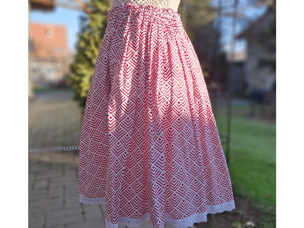 Folklórna sukňa pre dospelú ženu v červeno-bielom geometrickom vzore, doplnená o jemnú bavlnenú madeiru v dolnej časti, pôsobí elegantne a nadčasovo. Je ušitá zo 100 % bavlny a vďaka nastaviteľnej gume v páse ponúka pohodlie aj krásny ženský vzhľad.