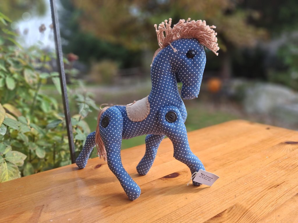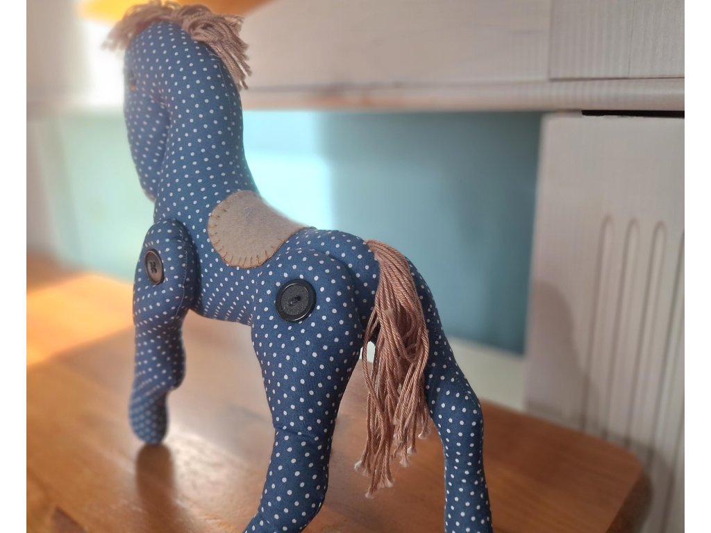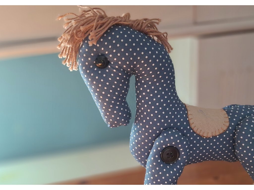 Ručne šitý textilný koník modro-petrolejovej farby s jemnými bielymi bodkami má pohyblivé nohy pripevnené gombíkom a vlásky z vlny. Mäkká a originálna handmade hračka, ktorú je možné postaviť a ktorá rozvíja detskú fantáziu.