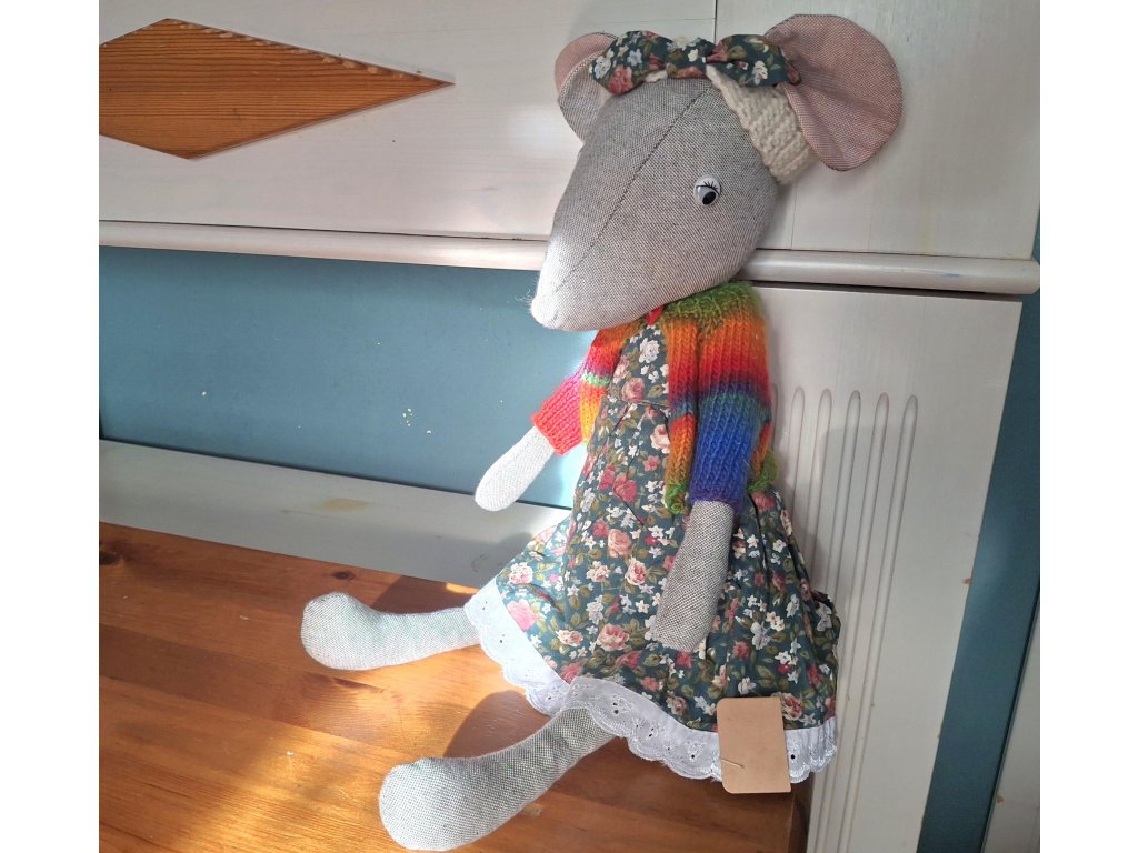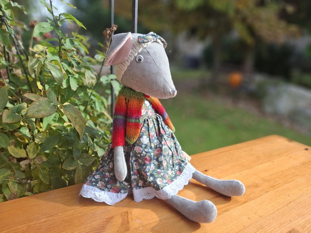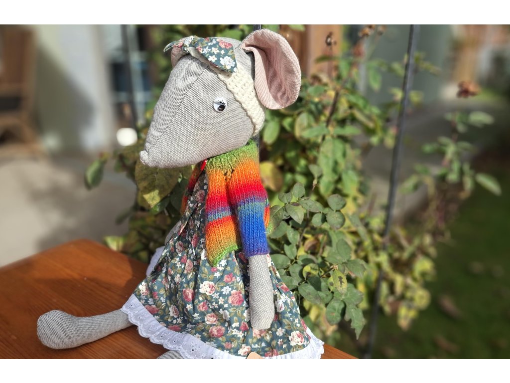 Ručne vyrobená handmade hračka – myš šedej farby oblečená v šatách s dolnou čipkou, šitými nohavičkami, pleteným svetríkom a háčkovanou čelenkou s mašľou. Mäkká, originálna a bezpečná hračka, ktorá rozvíja fantáziu a stane sa obľúbenou spoločníčkou detí.