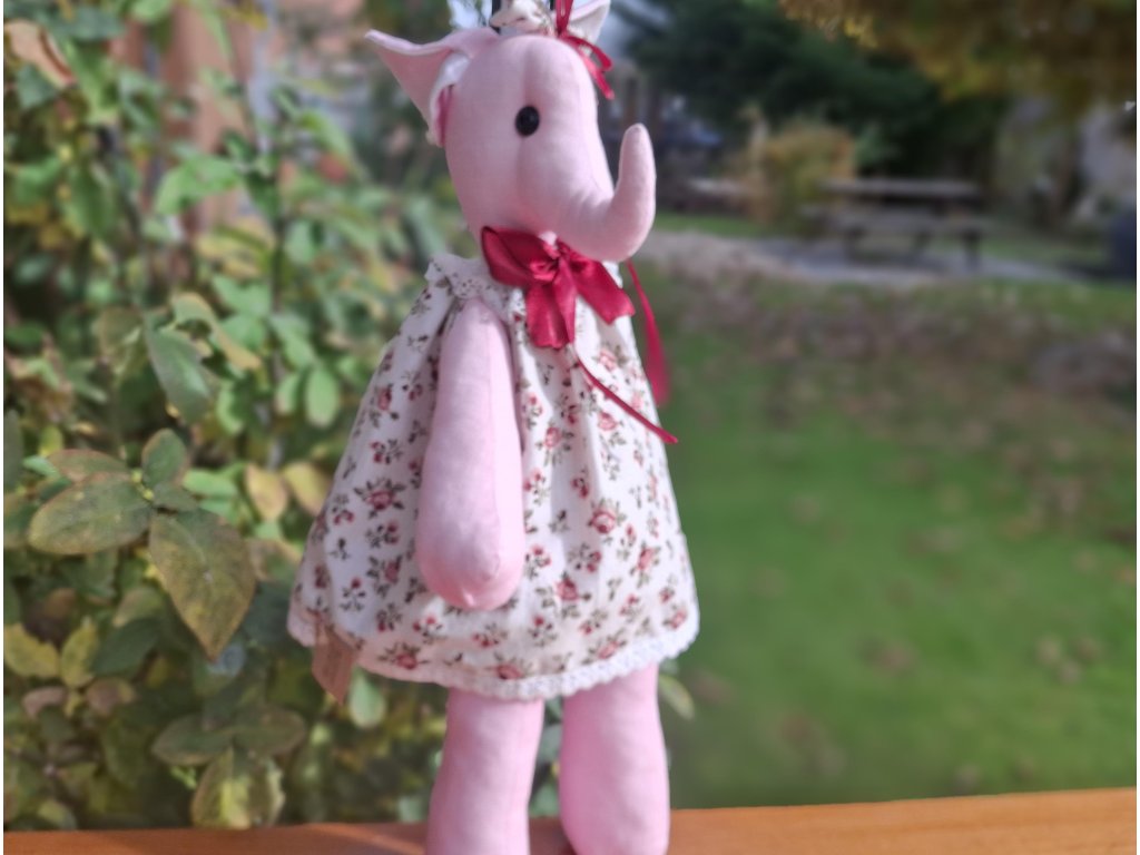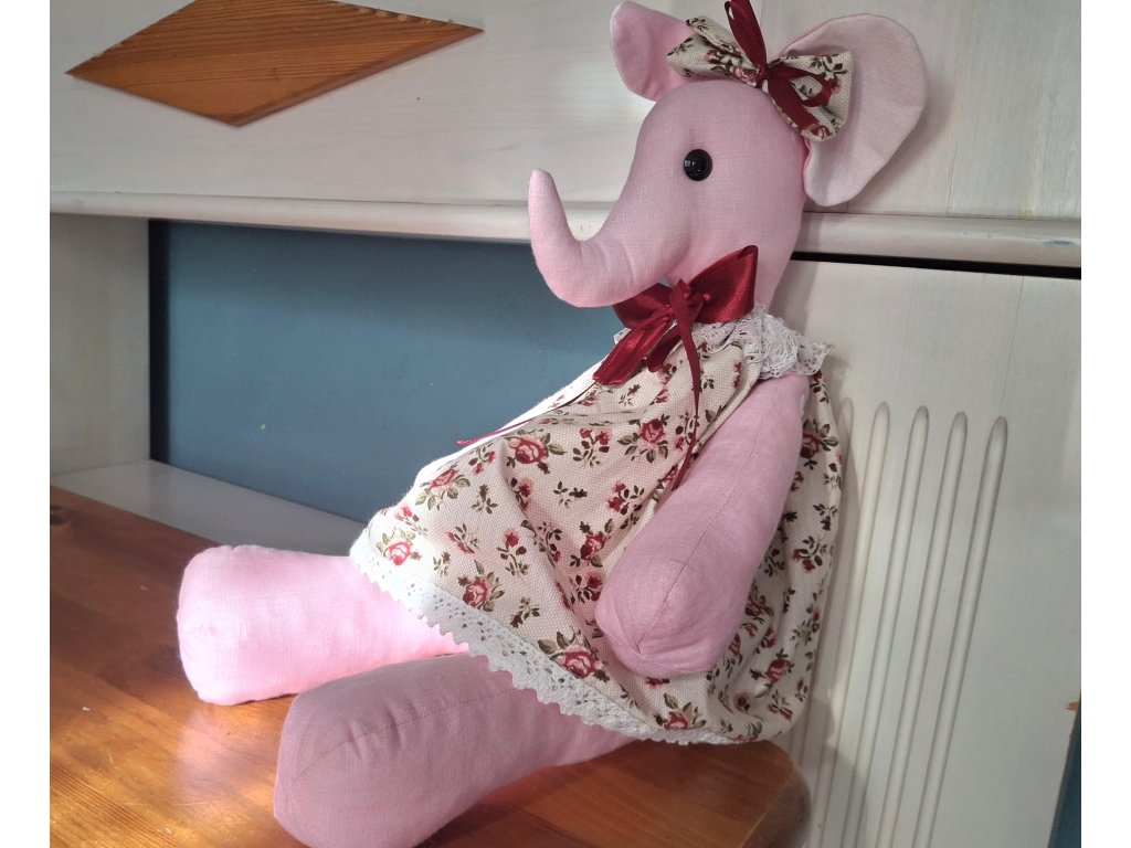 Ručne šitý textilný slon ružovej farby oblečený v šatách so vzorom ruží, čipkou, nohavičkami a mašľou na hlave. Pohyblivé ruky a nohy umožňujú hru a rozvíjajú detskú fantáziu, pričom hračka je mäkká a bezpečná.