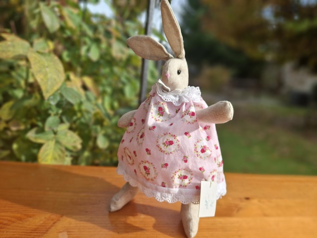 Ručne šitý textilný zajačik béžovej farby oblečený v šatách s ružami a čipkou, doplnených všitými nohavičkami. Mäkká, bezpečná a originálna handmade hračka ideálna pre deti alebo ako darček.