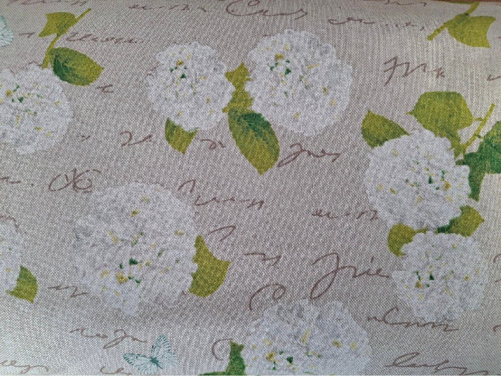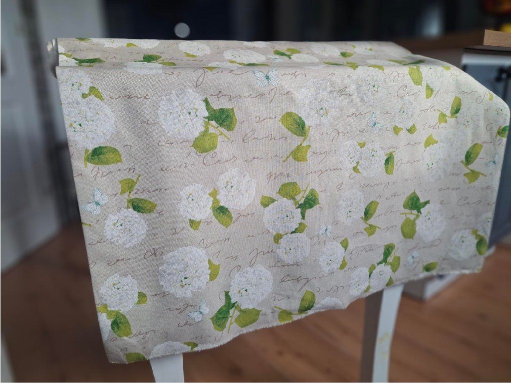 Jemná dekoračná látka s elegantným kvetinovým motívom bielych kvetov Hortenzií a zelených listov na prírodnom podklade (béžovej farby) , doplnená o decentné písmo. Vhodná na bytový textil, závesy, vankúše či romantické dekorácie.