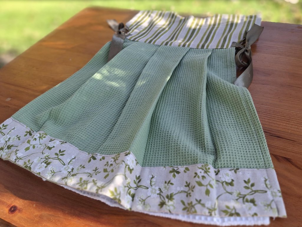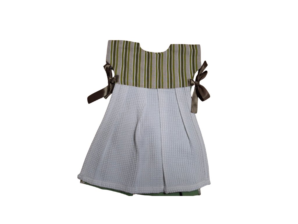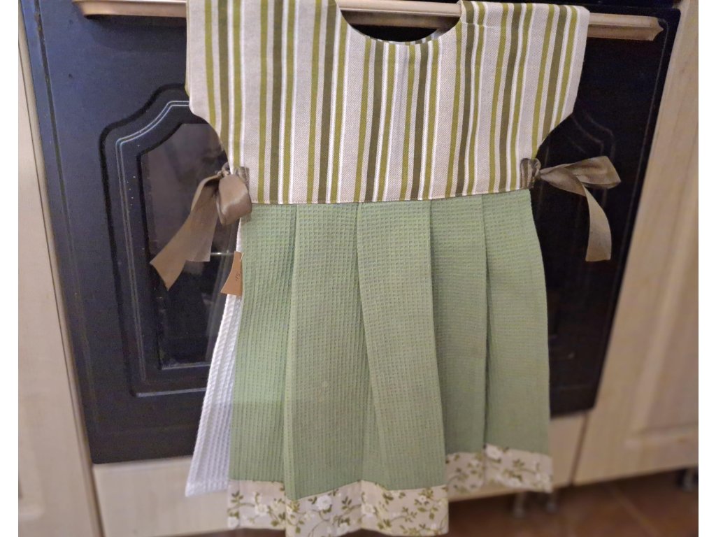 Dekoračná utierka olivovo zelenej farby s pásikmi na vrchu a bielou zadnou stranou oživí vašu kuchyňu a krásne sa hodí na dvierka rúry. Elegantný doplnok dostupný v rôznych vzoroch.